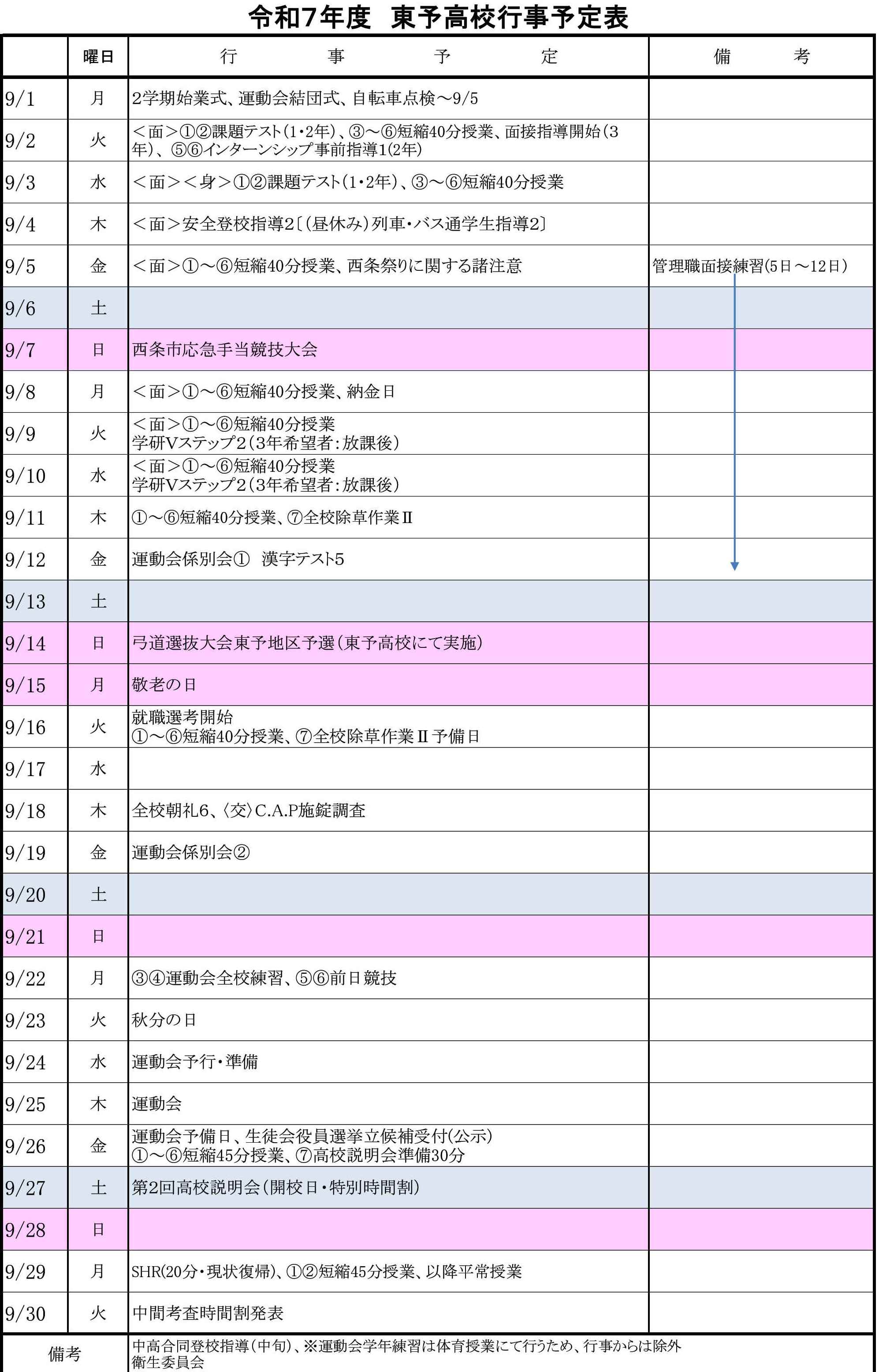保健環境課からの一部、行事予定変更について 2020年4月20日 15時47分 ○ 5月7日(木)全校除草作業は中止になりました。普通授業時程になりま す。○ 5月12日(火)非常時訓練は、6月15日(月)に延期になりました。○ 5月15日(金)尿検査2次は延期になりました。